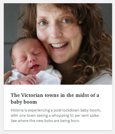 维州正在经历一场“封锁后的婴儿潮”,其中一个城镇的出生率甚至达到惊人的51%。对此,维州政府表示将拨款1320元(澳元,下同)进行支持。