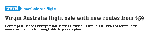 针对上述航线,维珍澳洲从10日开始提供59澳元单程经济舱机票,机票活动持续到8月13日午夜,或直到机票售罄为止。