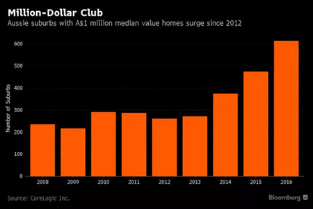 房地产研究机构CoreLogic的数字显示,澳洲经过四年的房市景气期后,房价中位数达一百万的城区大幅增加。到六月底,澳洲共有613个百万城区,较一年前上升29%!全国首府