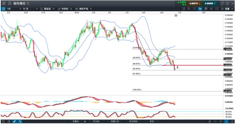 之前有谈及过由于新西兰经济降温,纽币难脱走弱的趋势势,本周的两个经济数据再给纽币进一步施压,纽币对美元汇率昨日破位重要支持价格0.6850下跌,打开了熊市行情。