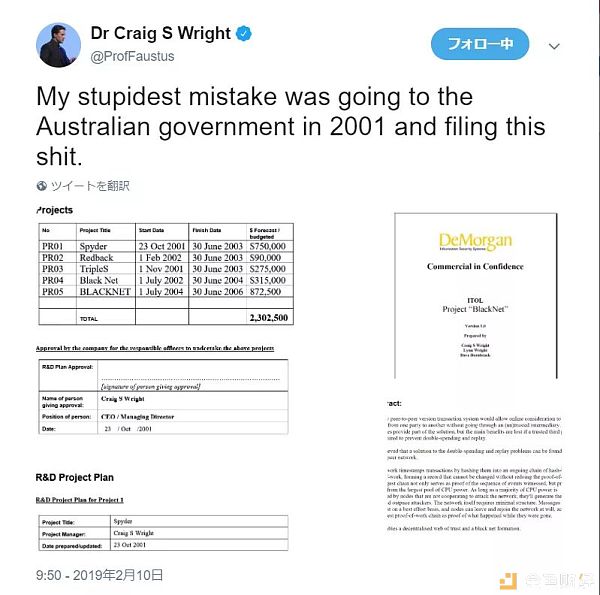 2 月 10 日,澳本聪在推特上发布一份内容显示和中本聪的比特币白皮书内容存在诸多相似之处的项目 BlackNet,再次给出其自证中本聪身份的证据。澳本聪称“自己最愚蠢的错误就是于 2001 年向澳大利亚政府提交了狗屎(BlackNet 项目)。”