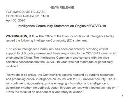 中新网5月1日电综合外媒报道,当地时间4月30日,美国国家情报局局长办公室在官方网站上发布声明,称“整个情报界一直以来都在向美国决策者和相关人员,提供在中国暴发