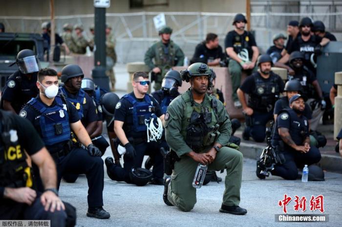 资料图:当地时间6月1日,乔治亚州亚特兰大市中心,警察和抗议者一起跪地抗议。 美亚特兰大非裔男子遭警察射杀 当地时间12日晚上,27岁非