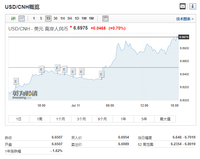 7月11日,离岸人民币兑美元跌破6.7关口,日内跌约500点。截至发稿,离岸人民币兑美元报6.6975,在岸人民币兑美元报6.6754。来自中国外汇交易中心的数据显示,11日人