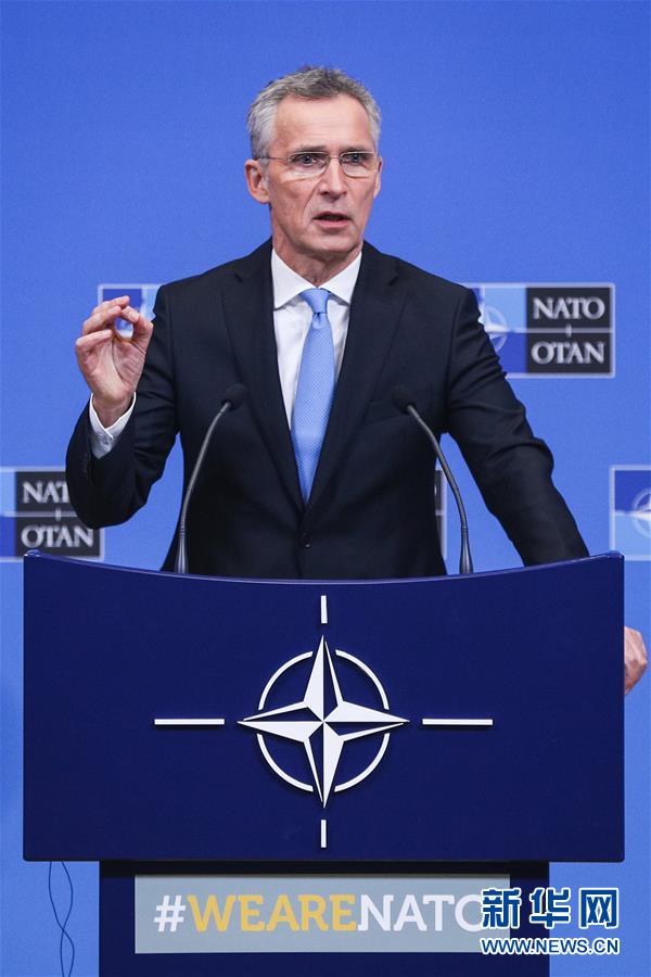 2月14日,在比利时首都布鲁塞尔的北约总部,北约秘书长斯托尔滕贝格在北约国防部长会议后出席新闻发布会。北约国防部长会议当天在位于比利时首都布鲁塞尔的北约总部