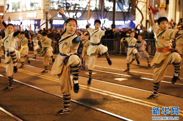2月23日,在美国旧金山,旧金山少林寺文化中心的学员参加农历新年大巡游。当晚,美国旧金山举行中国农历新年大巡游活动。农历新年大巡游是旧金山一项传统活动,迄今已