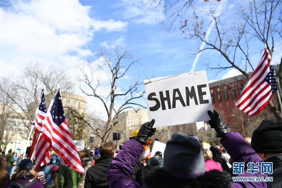 2月18日,在美国首都华盛顿,抗议者举行示威活动。美国多地18日举行示威活动,抗议总统特朗普宣布南部边境出现“国家紧急状态”以绕过国会筹集更多资金用于美墨边境