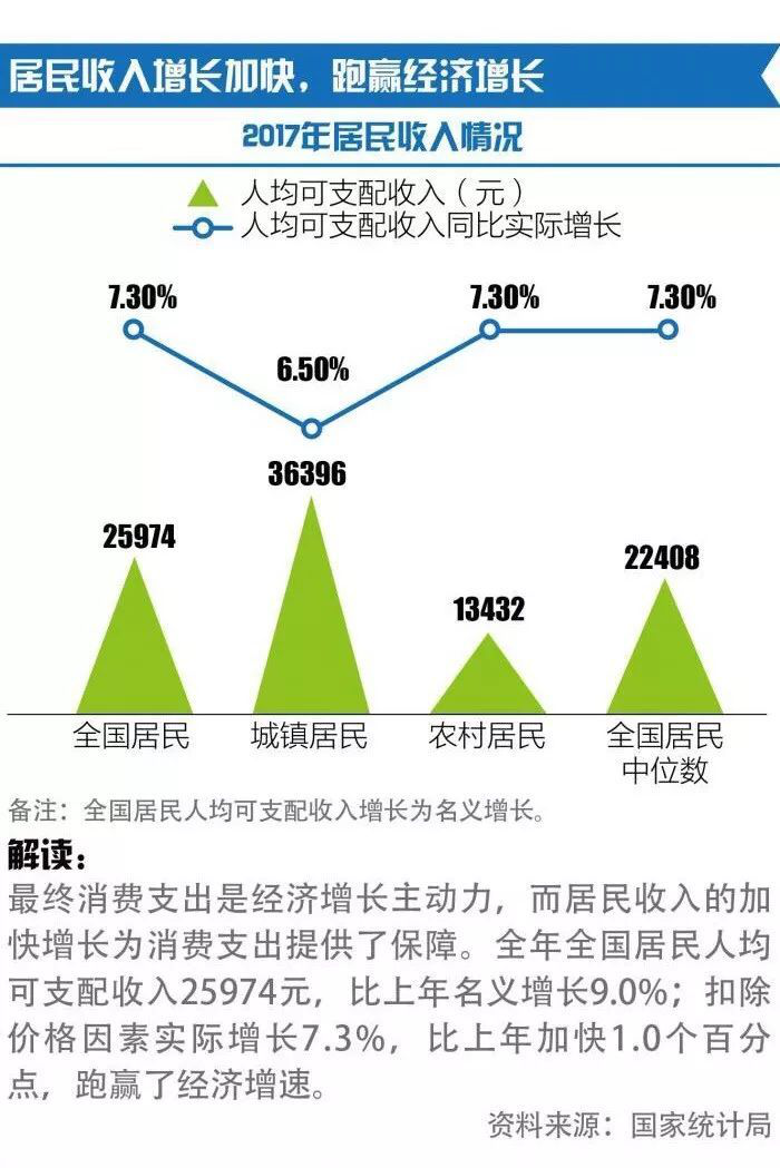 收入方面,2017年全国居民人均可支配收入(下称“居民收入”)为25974元,比上年名义增长9.0%,扣除价格因素,实际增长7.3%,比上年加快1个百分点,跑赢GDP(国内生产总值)增速。