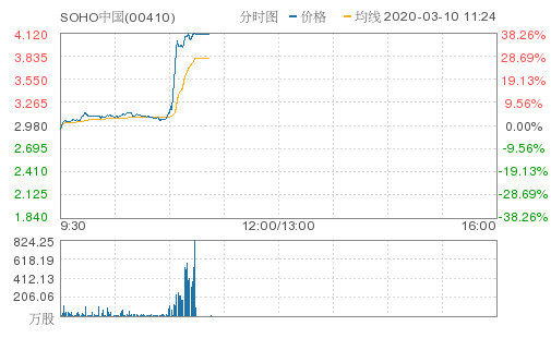 3月10日,SOHO中国在香港暂停交易,最新报4.10元,涨37.58%,最新市值213亿港元。