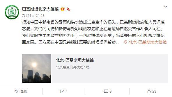 巴基斯坦驻华大使馆21日在微博上写道,得知中国河南省的暴雨和洪水造成宝贵生命的损失,巴基斯坦政府和人民深感悲痛。“我们期盼在中国政府的努力下,一切尽快恢复正常,流离失所的人们能够尽快返回家园。巴方愿在中国兄弟姐妹需要的时候提供帮助。”