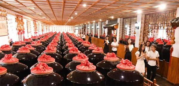---酵,蒸料后摊平冷却,加入传统大曲,大缸酒精发酵,历时21600分钟,酵后辅以麸皮、谷糠、稻壳,每日手工翻醅,发酵12960分钟。
