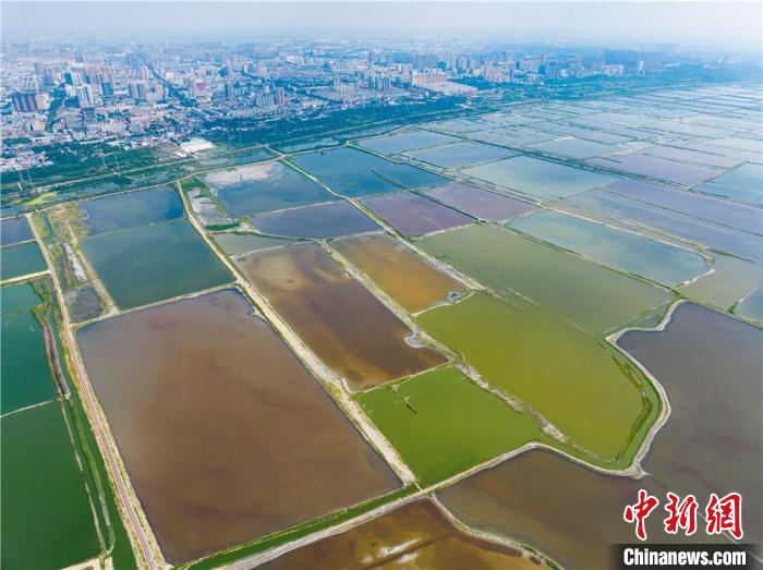 在盐湖观景平台、环湖绿道等地,水鸟翱翔、满眼珠翠,不时有游客打卡拍照。受高温和湖中藻类生长影响,早年用于工业生产的田畦呈现出斑斓色彩,七彩盐湖正成为城市的地理标签。