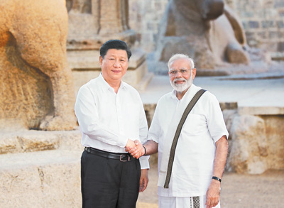 10月11日,国家主席习近平在金奈会见印度总理莫迪。 新华社记者鞠鹏摄 本报印度金奈10月11日电(记者杜尚泽、管克江)国家