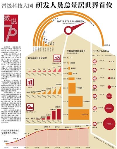 晋级科技大国研发人员总量居世界首位 新京报讯(记者陈维城)曾经的人口大国,科技小国,历经70年,我国已经成为世界上具有重要影响力的科技大国。̳