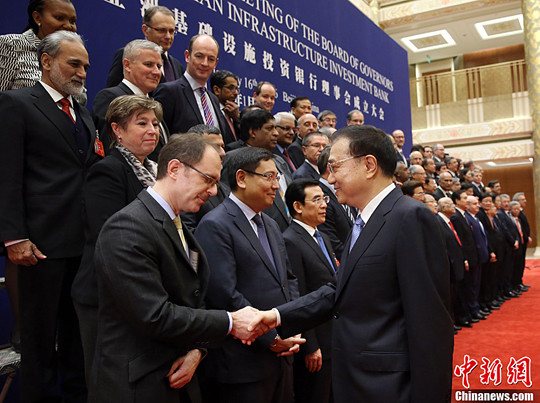1月16日下午,中国国务院总理李克强出席在北京钓鱼台芳华苑举行的亚洲基础设施投资银行理事会成立大会并致辞。会前,李克强同出席亚投行理事会成立大会的57个创始成