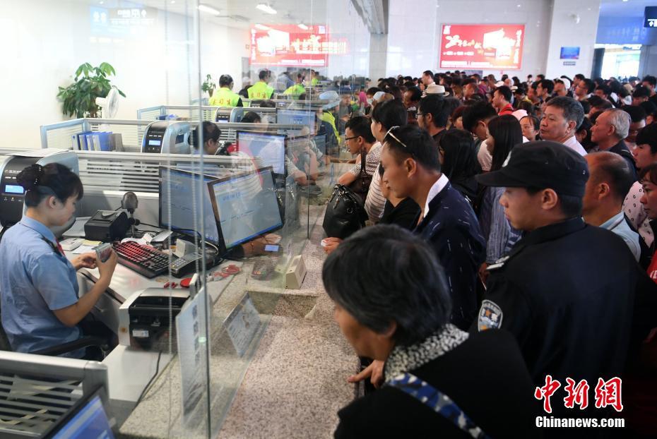 7月17日,昆明南站3号售票厅里在排队办理手续的旅客。当日,受持续降雨贵州境内影响,导致今天昆明经沪昆高铁前往北京、上海、长沙、南京、武汉、贵阳等方向37趟动车