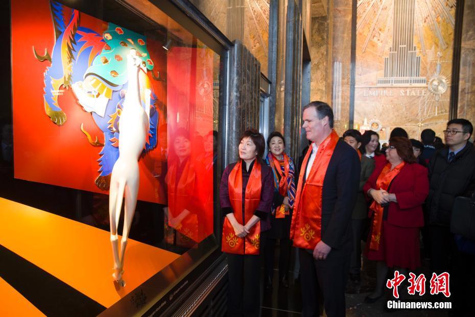 当地时间2月13日,帝国大厦狗年欢乐春节橱窗展在纽约帝国大厦一层亮相,展览为期一个月。图为中国驻纽约总领事章启月(左一)同帝国大厦集团总裁兼首席运营官约翰·凯