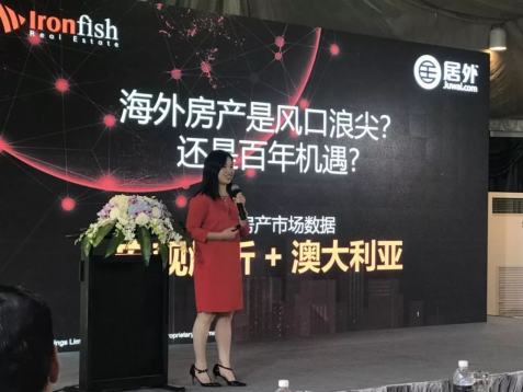 随后,著名中文海外房产平台——居外网CEO及董事Carrie女士上台致辞。开场就用她特有的港式普通话为大家营造了轻松的气氛,为大家分享了一些关于澳洲房市最具经验的市场见解并解析了全球房产中澳大利亚的房产趋势。
