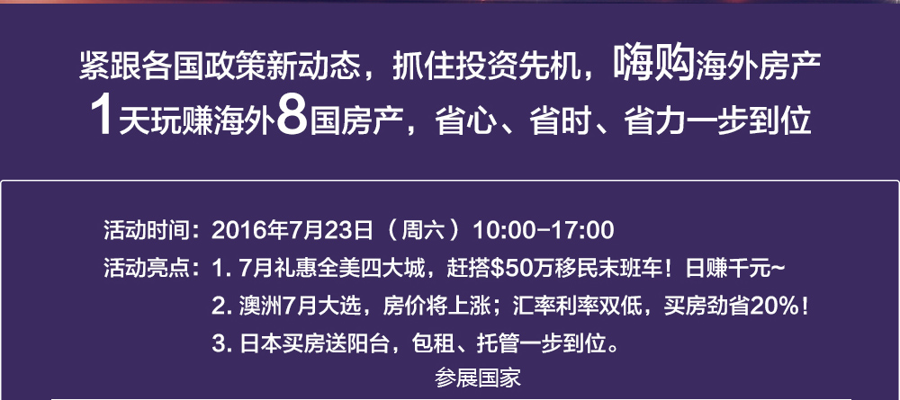 展会主题:2016年大型澳洲房产投资展预约电话:400-1122-388展会时间:7月16日(周六上午10点-下午6点)酒店地图:http://j.map.baidu.com/GioVA展会酒店:上海市黄浦区