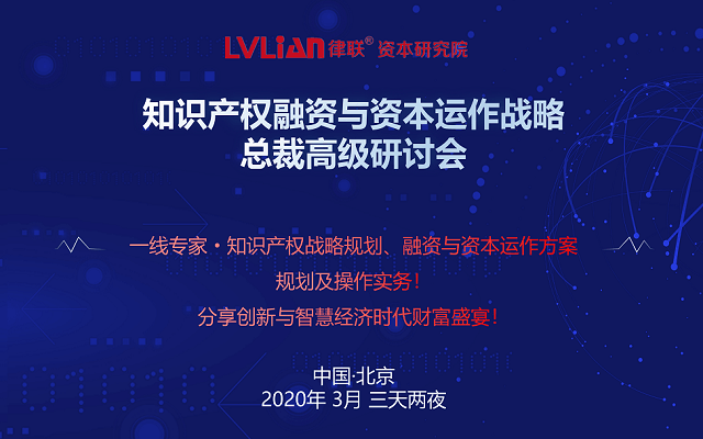 2020知识产权融资与资本运作战略总裁高级研讨会(北京)会议时间:2020-03-2709:00至2020-03-2917:00结束会议地点:北京详细地址会前通知主办单位:律联资本研究院课程