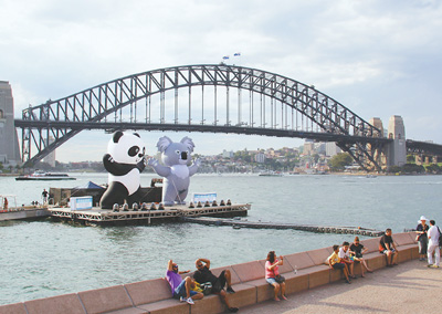 2月5日,澳大利亚悉尼歌剧院人头攒动,一派喜气洋洋。不远处的港湾里,憨态可掬的吉祥物卡通大熊猫和考拉随风荡漾,吸引众多游客驻足观看。当天,2017“中澳旅游年”正式拉开帷幕。中澳旅游部门、中国驻澳外交机构、两国旅游企业界、旅澳华侨华人以及当地市民、青年学生代表等2000余人出席活动。双方还举办了《国之瑰宝》民族音乐会和焰火表演等活动。