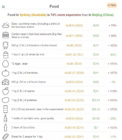 民以食为天,以悉尼为例,食物价格比北京高74%。澳洲蔬果的价格动辄人民币2位数起,一把小葱20元人民币,一公斤番茄120元……