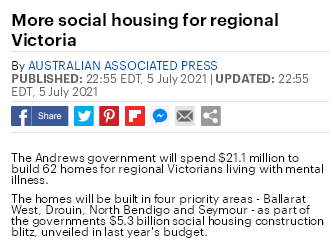 除此之外,在Epping,Laverton,Mooroopna和Pakenham有84所住房正在建设中,还有16所住房在Geelong郊区Highton完工,花费了2810万元。