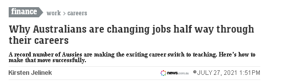 根据SEEK近日发布的数据显示,去年有创纪录数量的澳人转行当教师。据悉,有教师认为,从教学中可以获得满足和快乐,并有办法平衡生活和工作。