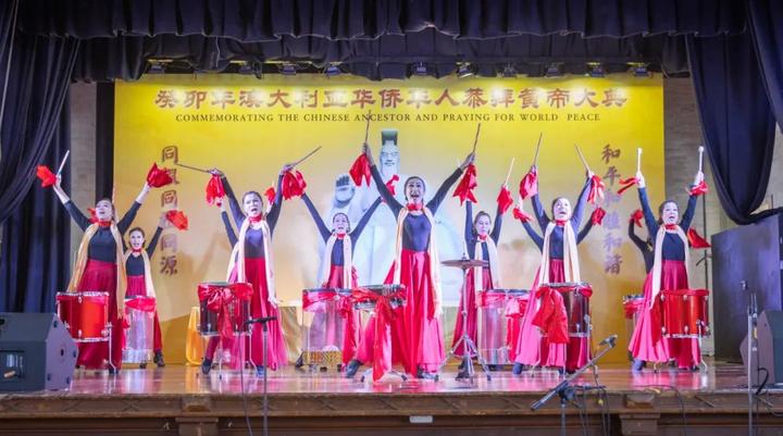 锣鼓喧天“迎拜始祖”。澳大利亚东方歌舞团充满激情和力量的鼓舞表演拉开了拜祖仪式的大幕。