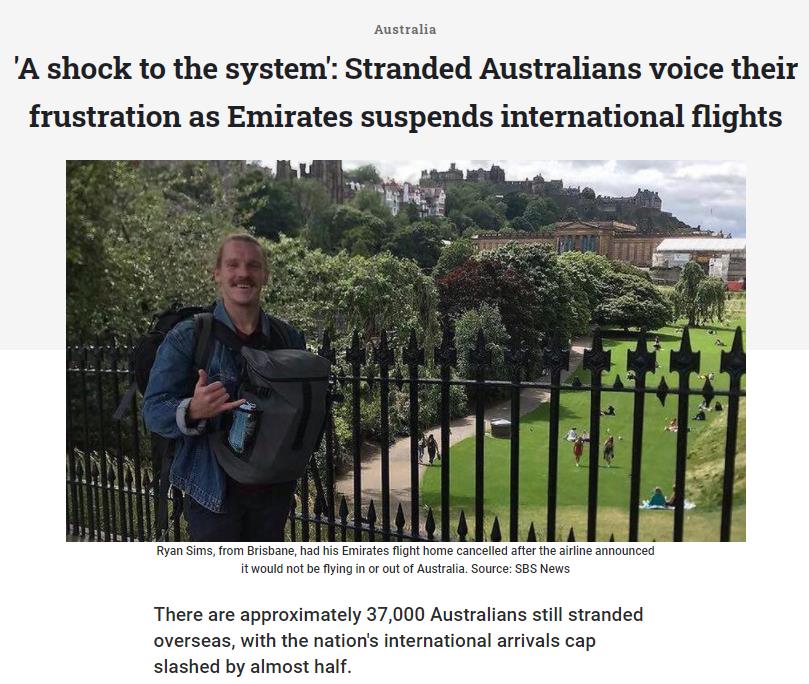 阿联酋航空来澳航班取消,被困海外澳人无法返澳。澳洲的国际入境人数上限近日被削减了近一半,目前,约有3.7万名澳人仍被困在海外。在阿联酋航空公司(Emirates)近日