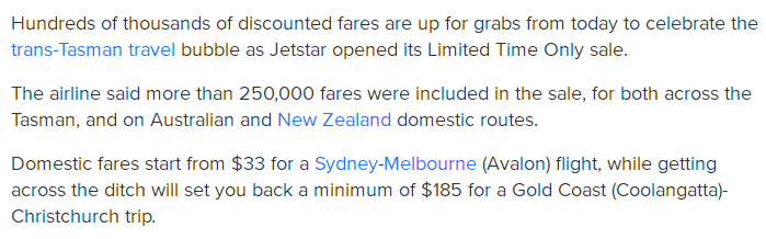 为了庆祝澳洲和新西兰之间的旅行泡泡(travelbubble)启动,捷星航空(Jetstar)23日推出最新的限时折扣活动,放出超过25万张机票,包括国内及澳新航线。同时,霍巴特也因
