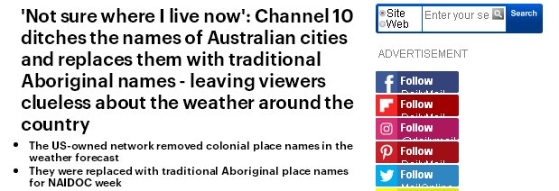 第10频道(Channel10)4日晚在天气预报中把澳洲城市的英文名称换成了传统原住民的名称,旨在吸引更年轻、“崇尚社会进步”的观众。据悉,此举也是为了庆祝NAIDOC原住