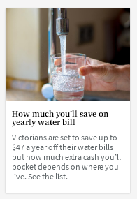 根据维州基础服务委员会(ESC)1日宣布的变动,墨尔本家庭平均每年最多可节省47元(澳元,下同)水费。其中,墨尔本西部GreaterWesternWater的居民将成为最大的赢家,一年
