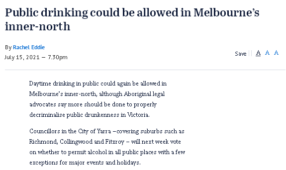 尽管有倡议者表示应该采取更多手段,让在公共场合适度饮酒合法化,但墨尔本Yarra市议会将于下周二(7月20日)就此进行投票。Yarra市管辖范围包括Richmond、Collingwo