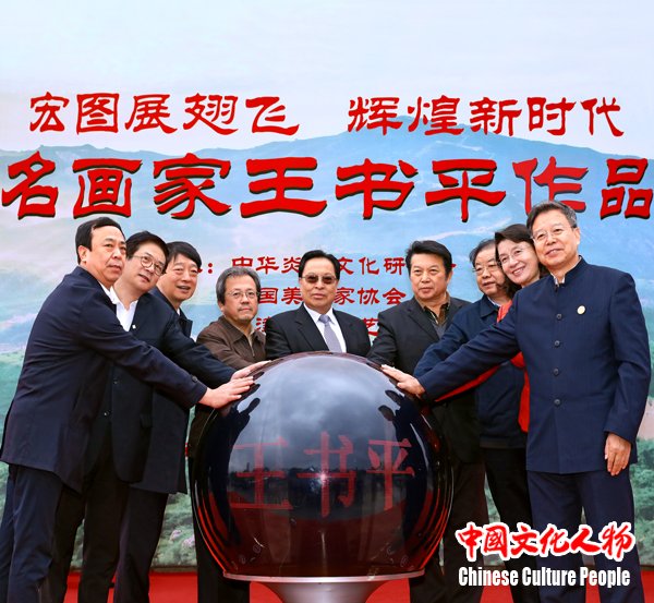 中华炎黄文化研究会首席顾问、中共河南省委原书记徐光春,全国政协常委、全国政协书画室副主任、第九届中国文联副主席覃志刚,中国文联副主席、中央文史馆常务副馆长、中国美协副主席冯远,天津市政协副主席黎昌晋,河北省政协副主席卢晓光,中国美术家协会分党组书记、驻会副主席、秘书长徐里,天津市文联党组书记、常务副主席万镜明,中华炎黄文化研究会常务副会长兼秘书长张希清,中共迁安市委副书记李福林等领导嘉宾共同启动水晶球为“宏图展翅飞 辉煌新时代——著名画家王书平作品展”揭幕