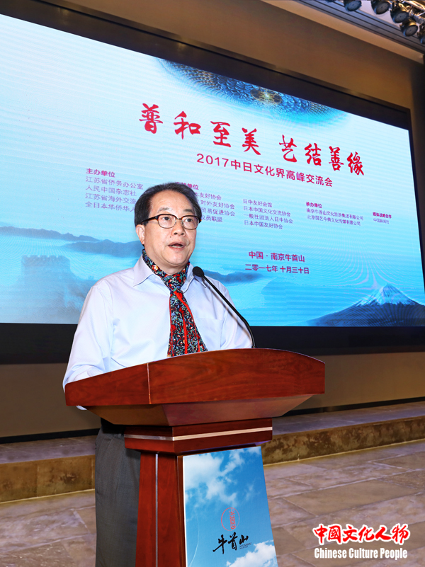 中国文化人物10月30日(主编 王保胜)10月30日,由江苏省侨办、人民中国杂志社、江苏省海外交流协会、全日本华侨华人联合会主办的“普和至美·艺结善缘——2017中日文化界高峰交流会”在南京牛首山文化旅游区举行。中共中央宣传部原秘书长、中国政研会副会长官景辉,江苏省人民政府侨务办公室主任、江苏省海外交流协会会长王华,人民中国杂志社总编辑王众一,日本东京商工会议所特别顾问今野由梨,日本著名演员中野良子,日本著名画家藤岛博文,日本茶道里千家教授岩山宗修等中日两国专家学者、艺术家嘉宾及社会各界人士出席。全日本华侨华人联合会会长、全日本华人书法家协会名誉主席、日本中国书法学院院长、著名书法家刘洪友主持高峰交流会。中共中央宣传部原秘书长、中国政研会副会长官景辉,江苏省人民政府侨务办公室主任、江苏省海外交流协会会长王华,人民中国杂志社总编辑王众一,南京牛首山文化旅游区管委会常务副主任张宾等先后致辞。
