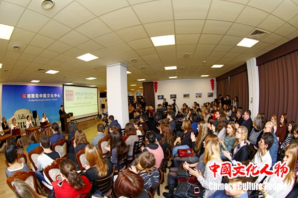 中国驻白俄罗斯大使崔启明,白俄文化部外联局长拉达贝丽斯卡娅,以及白俄罗斯国立大学、明斯克国立语言大学师生,白俄罗斯文化艺术界工作者,中国文化爱好者出席庆典,共同祝贺明斯克中国文化中心成立一周年