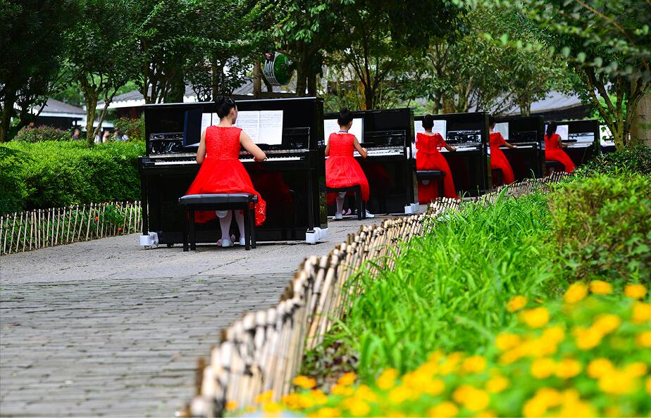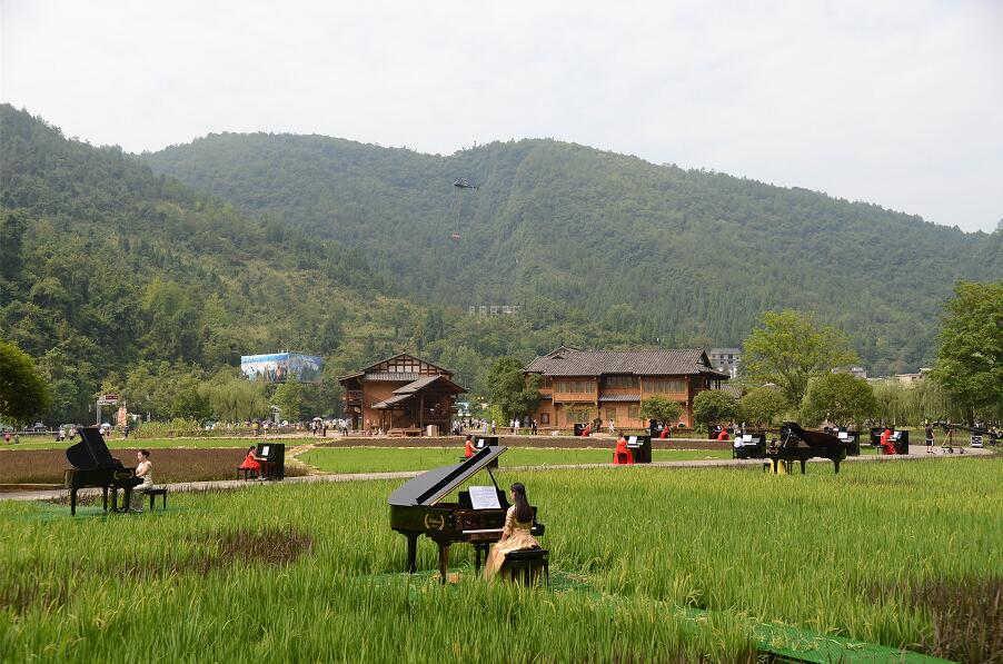 在御笔台演奏的钢琴重达500公斤,通过直升机吊装空降安放。一曲《我爱你,中国》拉开音乐会的序幕。之后,在15公里外的黄龙洞哈里路亚剧场绿色屋顶、沃野稻田的主演奏区,118架钢琴手和一个交响乐团、合唱团的数百名演员,完成了《在希望的田野上》《浏阳河》《欢乐颂》等三首经典名曲的演出,激情澎湃的天籁之音在绝美的大自然中唱响。接近尾声时,直升机又从御笔台峰顶,吊装着那台专门订制的大红色德国国宝级钢琴,徐徐降落在黄龙洞的主演奏区,为“2018黄龙音乐季开幕式”画上了圆满的句号。