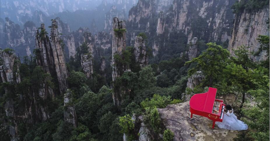 著名钢琴演奏家元杰面对张家界武陵源的三千奇峰,弹奏荡气回肠的《我爱你,中国》,拉开黄龙音乐季序幕
