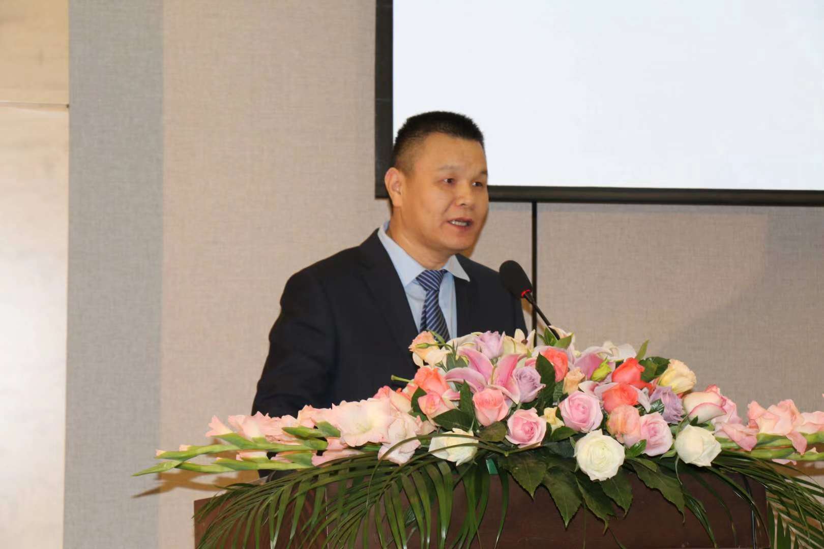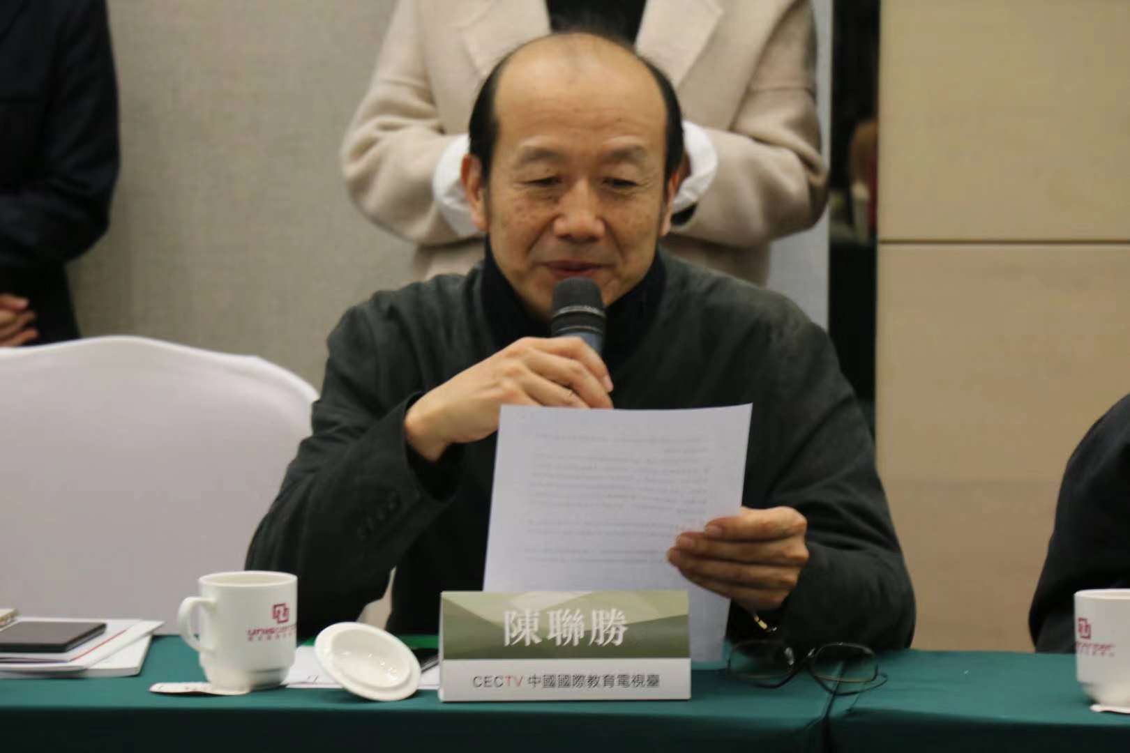 上图:中国国际教育电视台副台长陈联胜代北京外国语大学张西平教授宣读贺词