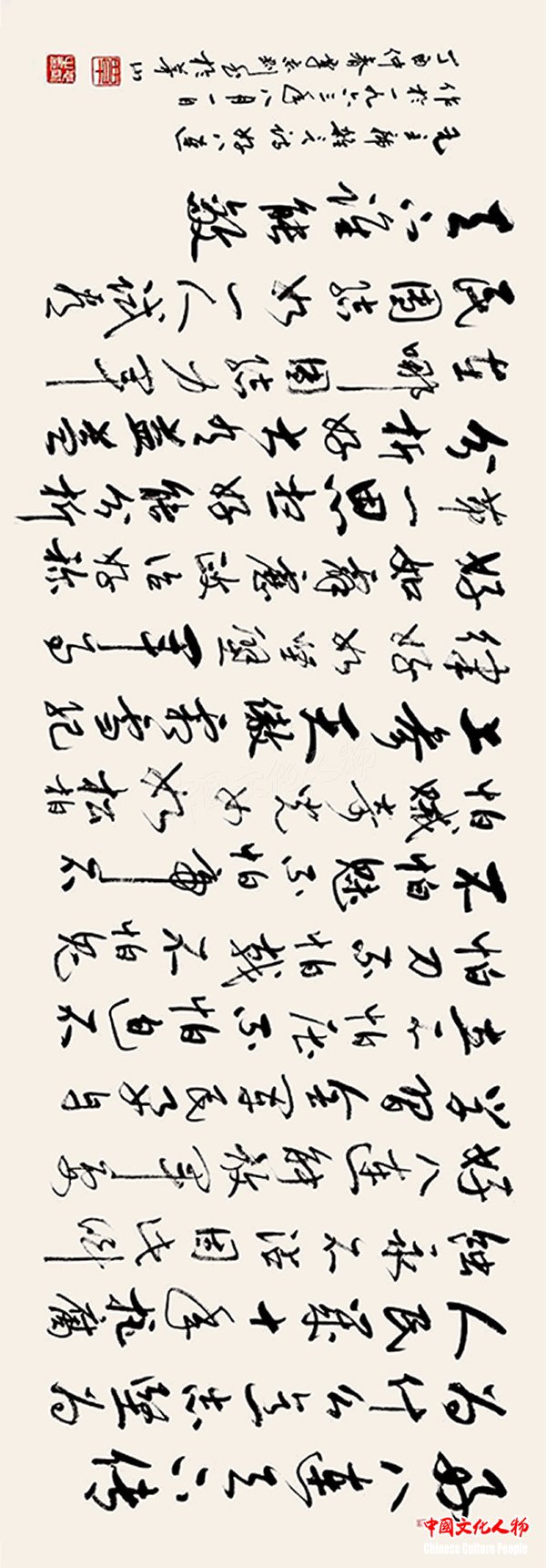 中国文化人物(主编 王保胜)为纪念毛泽东诞辰125周年,深切缅怀毛泽东同志的丰功伟绩,学习他的光辉思想、崇高品德和革命风范。由中央数字电视书画频道、中国文化人物杂志社主办的“激扬文字——纪念毛泽东诞辰125周年覃志刚书毛主席诗词书法展”将于12月25日在北京奥林匹克公园央视书画频道美术馆举行。