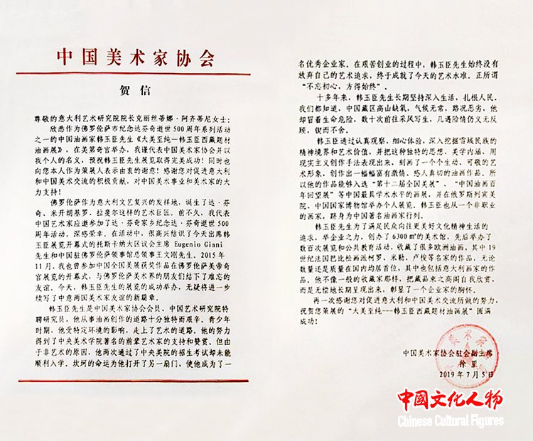 徐里在贺信中说:“佛罗伦萨作为意大利文艺复兴的发祥地,诞生了达·芬奇这样的艺术巨匠。今天,韩玉臣的展览无疑将进一步加深中意美术界之间的友谊。 韩玉臣是中国美协会员、中国美协油画艺委会名誉委员,他从事油画创作的道路十分独特而艰辛。他对艺术的热情萌生于青少年期间,但由于非艺术的原因,两次通过了中央美院的招生考试却未能顺利入学。坎坷的命运为他打开了另一扇门,使他成为了一名优秀企业家。在艰苦创业的过程中,韩玉臣始终没有放弃自己的艺术追求,10多年来,坚持深入生活,数十次到藏族地区,遇到过好多次险情,然而他始终锲而不舍、义无反顾。他通过认真观察体验、深入挖掘雪域民族的艺术价值、高原使命,把这种独特的思想、美学内涵,用现实主义表现形式表现出来。所以他的作品能够入选第十二届全国美展、中国油画百年回望展等最具学术水平的画展。韩玉臣从一个非职业的画家,跻身为中国著名油画家行列。”