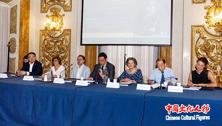 展览现场,韩玉臣向中国驻意大利佛罗伦萨总领事王文刚、意大利艺术研究院院长克丽丝蒂娜·阿齐蒂尼等出席开幕式的嘉宾介绍展览作品的创作历程