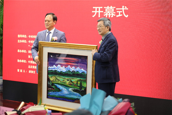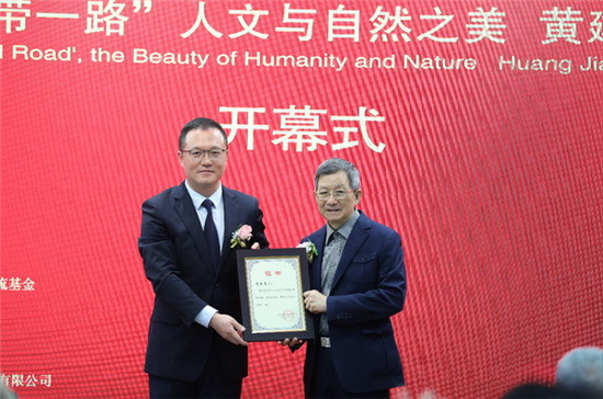 ▲中国国际文化交流基金会“一带一路”文化艺术交流基金主任陈君接受黄建南捐赠《高原之春》