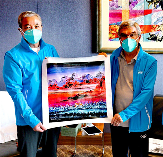 ▲东京奥运会期间,国际奥委会副主席于再清向巴赫(右)转交黄建南的油画《光辉历程》