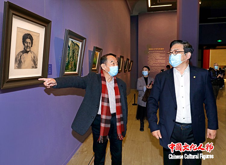 中国美术馆馆长吴为山(右)参观“璞心逐梦——韩玉臣油画写生作品展”时,对韩玉臣创作的讴歌人民、赞美生活、反映新时代大好河山的油画作品给予了高度赞赏