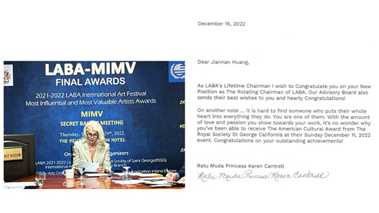 ▲凯伦·坎特雷尔公主担纲本次颁奖典礼的主持,右图为她写给黄建南的贺信。