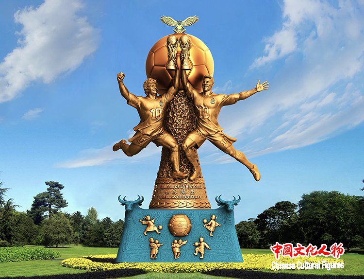 黄剑介绍:《世界球王》是为庆贺阿根廷荣获2022卡塔尔世界杯冠军和纪念中阿建交50周年而创作的大型纪念雕塑。作品以天圆地方为设计理念,表现足球的古与今:下部浮雕塑造了五个汉代儿童玩耍蹴鞠的快乐场景,上部则表现阿根廷球王马拉多纳和梅西如雄鹰展翅高举世界杯的英姿。展现了足球起源于中国,并通过“丝绸之路”传播到世界各地,尤其在南美阿根廷发扬光大的世界足球文明史。《世界球王》将在年底落成于阿根廷首都布宜诺斯艾利斯,将成为中阿友谊的伟大象征和共建“一带一路”倡议十周年国际文化交流的艺术丰碑!