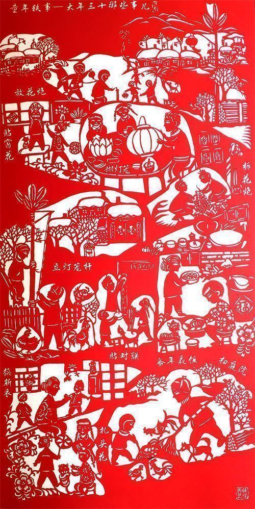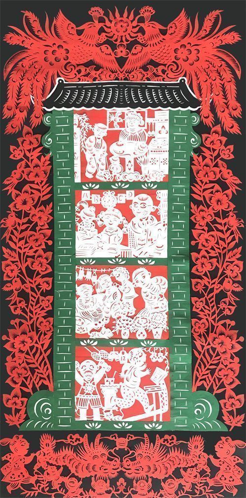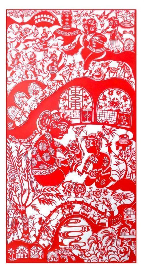 为了让大家了解真正的中国现代民间剪纸,我在这里选发近年来一些民间剪纸传承人创作的现代民间剪纸作品,供大家欣赏。这些传承人,大多是民间的农民或出身于农民家庭的知识分子,他们紧跟时代的步伐,在继承传统民间剪纸基础上努力创新。例如:陕西的余泽玲、李福爱、高玉兰、孙菁霞、李志梅、孟梅芳、郭佩珍、吴锦珍、曹毛女、李淑琴、李凤英、陈艳芬、郑飞燕、张玉芳、杨秀勤;山西的王计汝、崔春梅、郭润芝、杨毅、张善东、王春秀;内蒙的伍永娟、吕凤英;山东的齐秀花、任凭、黄玉华、陈淑香;宁夏的伏兆娥、赵文花;河南的畅杨杨、杨庆锋;甘肃的惠富君、曹永琴、成雪琴、段喜娥、张雪峰、马路、段彩霞、安惠玲、赵兴萍;安徽的程兴红;河北的石俊凤等等,他们是新一代有文化的民间剪纸传承人。从小都受到妈妈、奶奶的传授熏陶,打下了扎实的传统文化和民间剪纸的基础。由于长期生活在农村乡镇,熟悉农村乡镇生活,加之接受了城市文化和现代生活的影响,在内容、形式、材料上,都进行了大胆的创新,创作了不少反映农村现代生活题材和主题的民间剪纸,既传统,又时尚,发展为新一代现代民间剪纸,成为中国现代民间剪纸引领的先锋主力军,也是中国现代民间剪纸发展的方向。例如:郭佩珍的《乡城一片好风光》,此作品是郭佩珍在77岁到82岁耗时五年完成的精品之作。长13米宽90厘米。作品从自己居住的地方开始把佳县古城到白云道观完整剪在纸上,佳州古城整体坐落在山峰,黄河在县城脚下汤汤而过,白云道观整体的庙宇建筑全部剪于纸上(白云道观是中国西北地区最大的道观),作者生活在黄河岸边,作者把自己在生活中的所见所闻整体的表现在纸上。作品内容丰富,全面展现了黄河岸边人们的生活和民俗,同时也能了解当地道教文化。看过作品的人惊叹敬佩使人犹如亲临佳县。