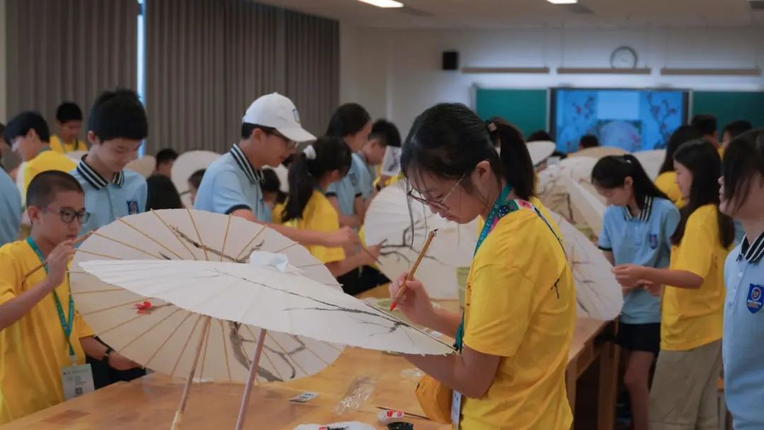 在老师的讲解和示范下,营员们和他们的小伙伴们开启水与墨的创作,一起交流、共同协作,雪白的纸伞在孩子们的手中变得不再单调,他们将国画与纸伞相结合,绘制出一幅幅美丽的传统纸伞画。